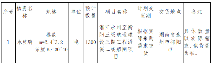 1、本次招標(biāo)項(xiàng)目為湖南省航務(wù)工程有限公司湘江永州至衡陽(yáng)三級(jí)航道建設(shè)三期工程浯溪二線(xiàn)船閘水玻璃采購(gòu)。