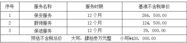 2.1采購范圍:保安服務(wù)主要負(fù)責(zé)對雙方確認(rèn)的生產(chǎn)、生活及辦公區(qū)域?qū)嵤┌踩Pl(wèi)工作;廚師服務(wù)主要負(fù)責(zé)按“四菜一湯、兩葷兩素”標(biāo)準(zhǔn)烹飪食材;保潔服務(wù)主要負(fù)責(zé)辦公、宿舍公共區(qū)域及附屬道路、綠化進(jìn)行衛(wèi)生的清掃工作。